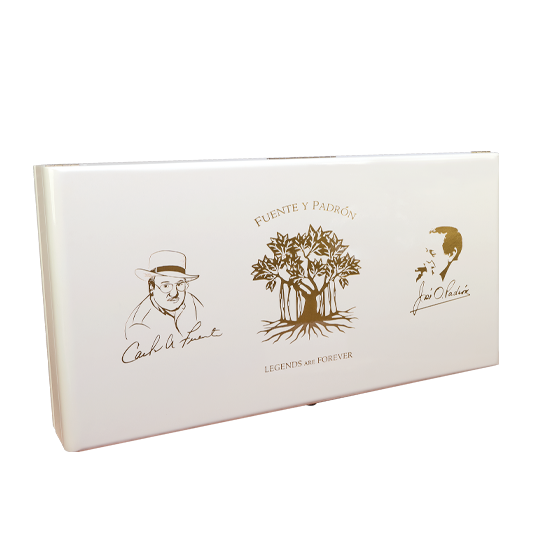 The box is detailed with colors, symbols and photographs illustrating the rich family histories and contributions to the cigar industry made by both families. Inside, there are two trays of 20 hand crafted cigars. One tray features cigars made by Padrón in honor of Carlos A. Fuente, Sr. The second tray features cigars made by Fuente in honor of José O. Padrón.